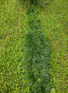 Observen la diferencia en el crecimiento de este Pasto Mundo, Ophiopogon japonicus, (seto verde oscuro) probablemente debido a una alteración del suelo en puntos especificos.