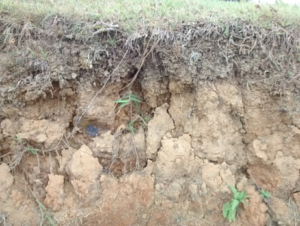Esta fotografía fue tomada a un poco menos de 1000 m.s.n.m. en Yotoco, Valle del Cauca, Colombia. El horizonte “A” marrón oscuro tan profundo, quizá se deba a que es una zona plana y baja en donde se deposita material de sedimentación proveniente de las montañas y transportadas por los ríos y las lluvias